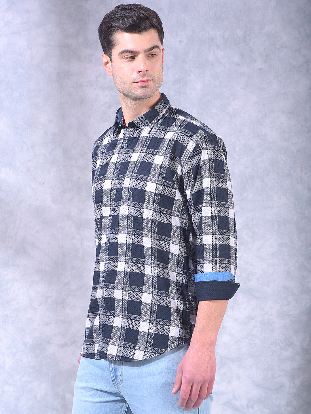 DONLAY MEN'S NAVY BLUE CHECKED SLIM-FIT CASUAL SHIRT
