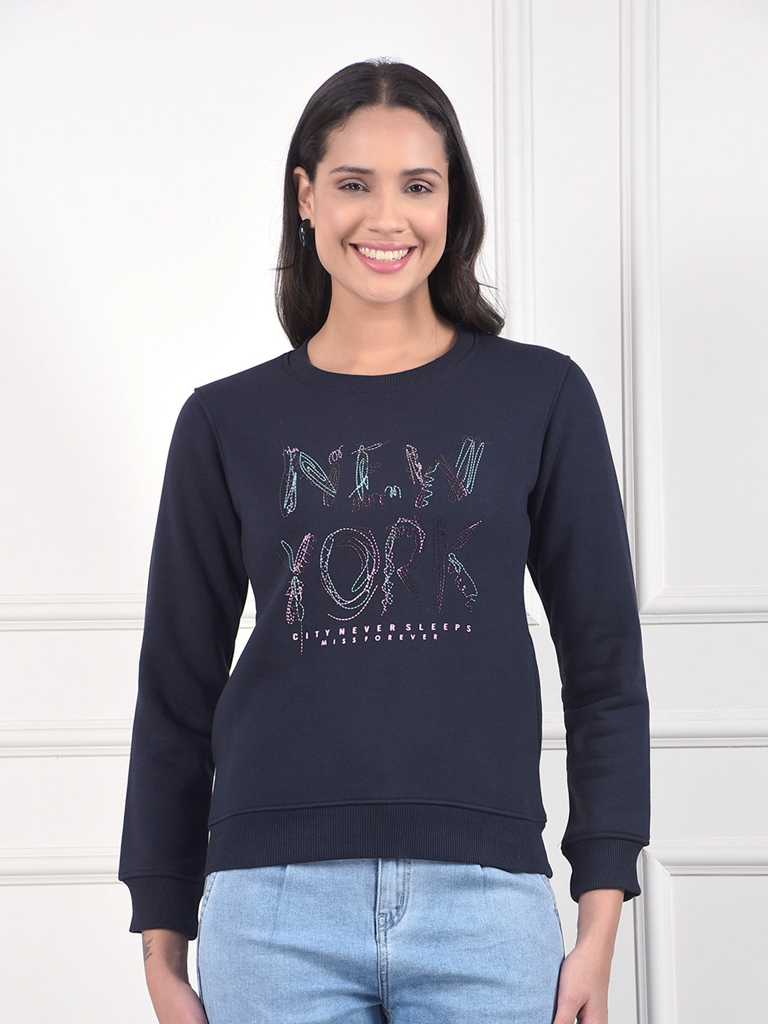 The Miss Forever Navy Blue Printed Sweatshirt combines bold color with casual comfort, offering a stylish and cozy option for effortless everyday wear.